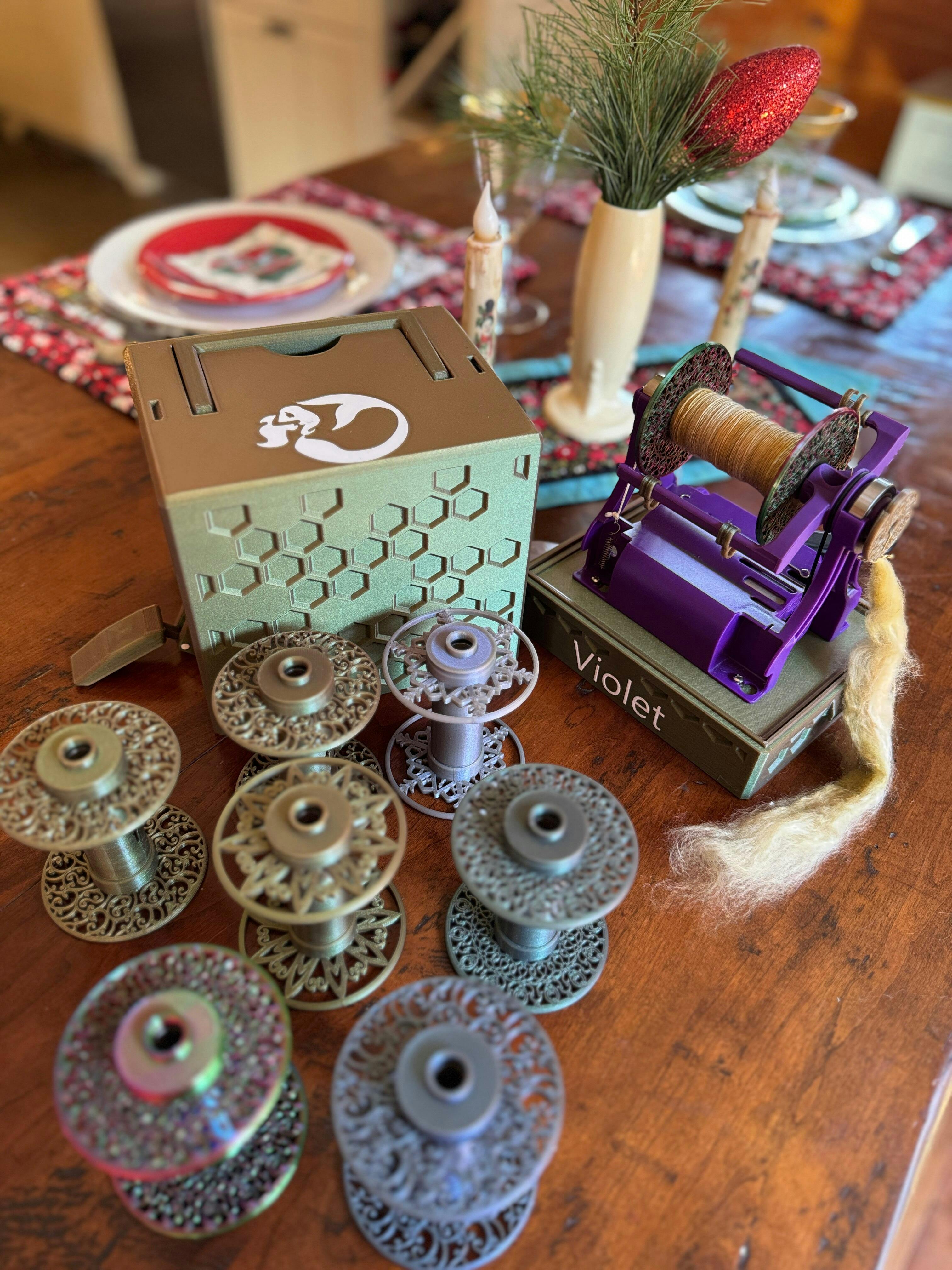 3D Print Disclaimer: 3D Printing leaves subtle variations on the print including lines and fill. It can create variations in the color print as well. Gradients and rainbow prints cannot be guarantied on which color the gradient starts and finishes. Please don't leave them next to direct heat such as fireplaces, stoves or heating vents, Don't leave them in direct sunlight, don't submerge them in hot water and don't leave them under tension from your yarn. Please screw in bobbin ends gently and tighten until they stop, do not force the bobbin to over tighten or it may break the threads, they should fit snug. All of these things can effect the integrality of the product.